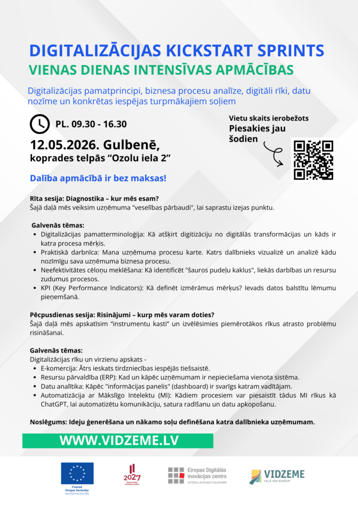Dažādu jomu uzņēmēji un organizāciju pārstāvji Vidzemē aicināti pieteikties “Digitalizācijas Kickstart Sprint” mācībām, kas notiks 12. maijā Gulbenē. Intensīvā vienas dienas treniņā dalībnieki saņems informāciju par praktisku digitalizācijas procesa uzsākšanu.