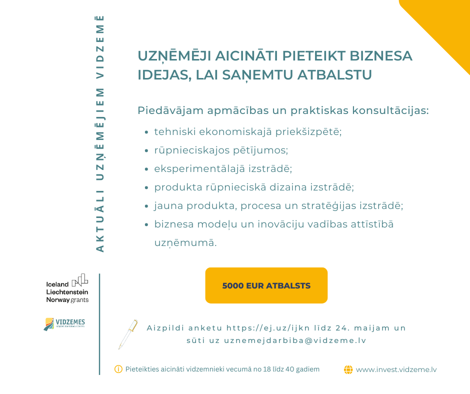 “Aicinām pieteikties jaunos uzņēmējus, kas šobrīd ir uzsākuši jaunu produktu vai pakalpojumu attīstību. Šī aktivitāte palīdzēs ne tikai izstrādāt konkrētus pētījumus vai testus, lai ātrāk izstrādātu savu produktu, bet arī ļaus iegūt zināšanas par soļiem, kas jāveic jaunu produktu vai pakalpojumu izstrādē. Mēs ceram, ka tas ilgtermiņā ļaus veiksmīgāk attīstīt arī citas biznesa idejas,” tā Vidzemes uzņēmējdarbības centra vadītāja Laima Engere-Levina.