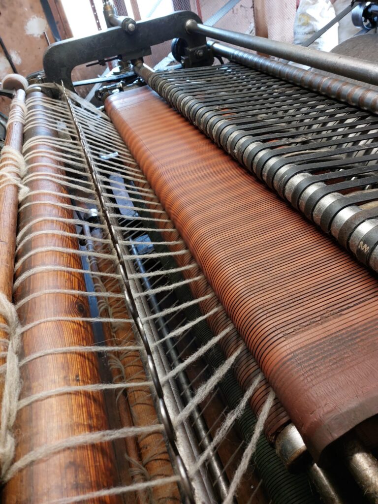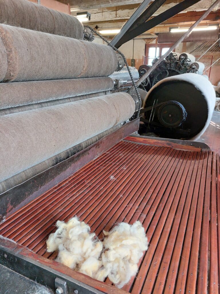 Tomēr visinteresantākās ir vilnas apstrādes mašīnas, kuras darbojas joprojām. Darbiniece ieslēdz gan kāršanas, gan vērpšanas iekārtas. Kārstuvē ir 19 ruļļi – viens par otru lielāks, vienam adatas uz vienu pusi, otram uz otru pusi. Kad vilna iziet visiem ruļļiem cauri, tā satinas ap lielo rulli. Vilnai jābūt izmazgātai. Tad liek uz nākamās mašīnas, kur atkal ir ruļļi. Cita iekārta šķeterē, tin spolītēs. Tagad gan mašīnu darbina elektrība un tā nav jāstumda ar rokām.