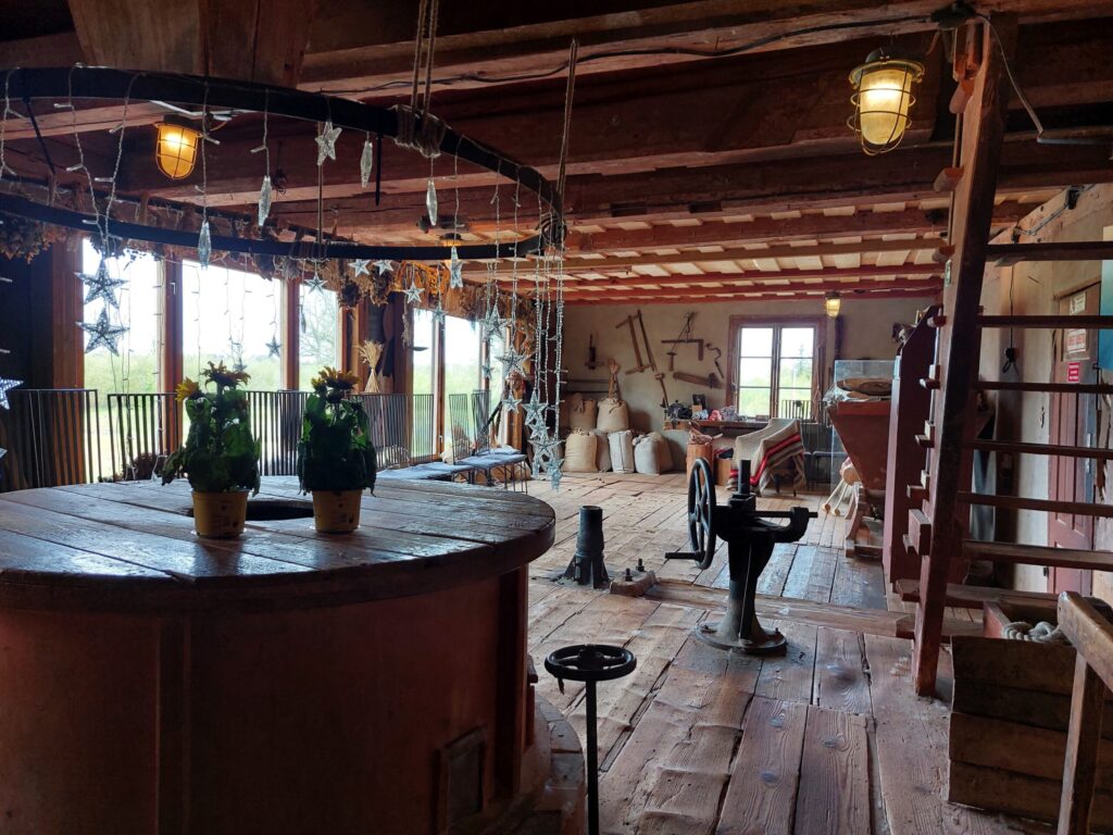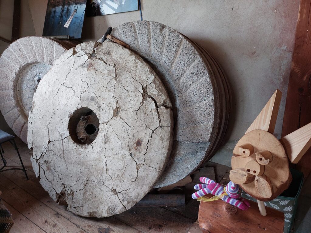 Lai tiktu dzirnavās, pie ieejas jāuzkāpj uz diezgan augsta pakāpiena. Tas ir tik augsts tāpēc, lai būtu vieglāk izkraut smagos maisus. Tagad maisi nav jākrauj, bet pakāpiens ir atstāts. Tad jau kā parasti dzirnavās maisus vispirms nosvēra, uzvilka uz otro stāvu un graudus izbēra. Samala tik smalkus, cik vajadzēja. Apakšā viss malās starp diviem dzirnakmeņiem. Apakšējais sver 300 kilogramus, augšējais vairāk nekā tonnu. “Tie nav laukakmeņi, bet lietie akmeņi,” saka darbiniece.