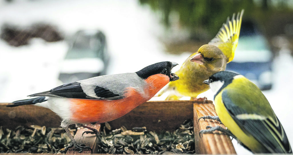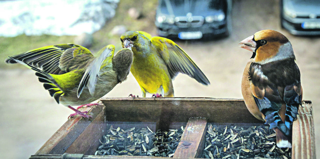 PUTNU vērotāja salaspilieša Egila Kazubierna barotavā vērojami dažādi putni. Viņš stāsta, ka visbravūrīgākās Latvijā ir zaļžubes, kuras var mesties cīņā ar jebkuru putnu, un pārējiem nākas pacīnīties, lai arī pamielotos.