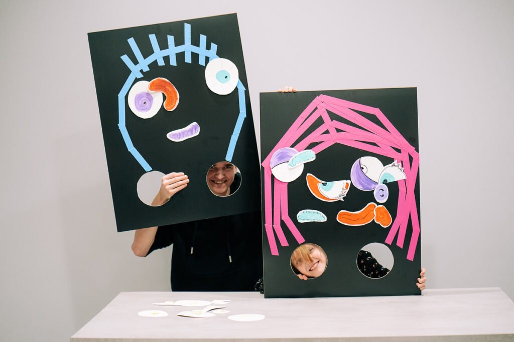 2. Uz abiem kartoniem ar krāsaino līmlenti izveido sejas veidolu.