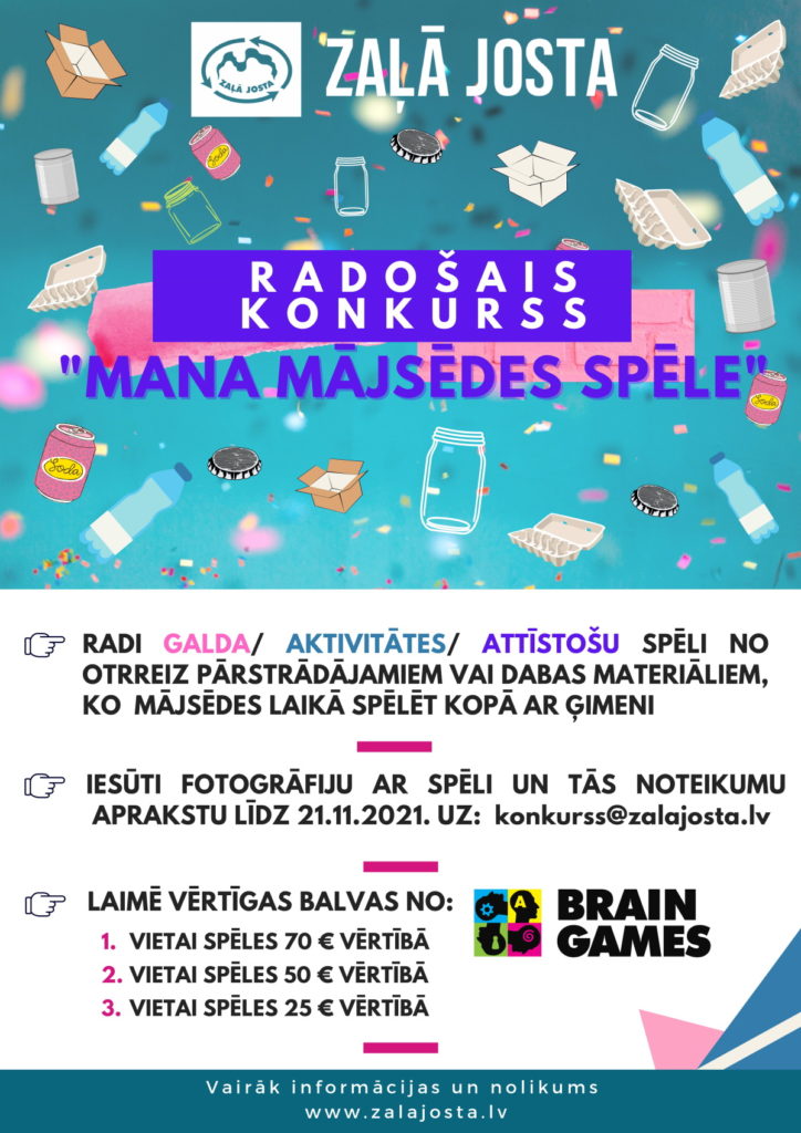 Lai motivētu iedzīvotājus mājsēdes laikā pavadīt vakarus ģimenes lokā jēgpilni un videi draudzīgi, “Zaļā josta” sadarbībā ar spēļu veikalu “Brain Games” izsludina konkursu “Mana mājsēdes spēle”. Konkursa dalībnieki aicināti no otrreizējām izejvielām un dabas materiāliem radīt jaunas, ģimenes lokā spēlējamas spēles, tādējādi veicinot resursu atkārtotu izmantošanu un sekmējot aprites ekonomiku.