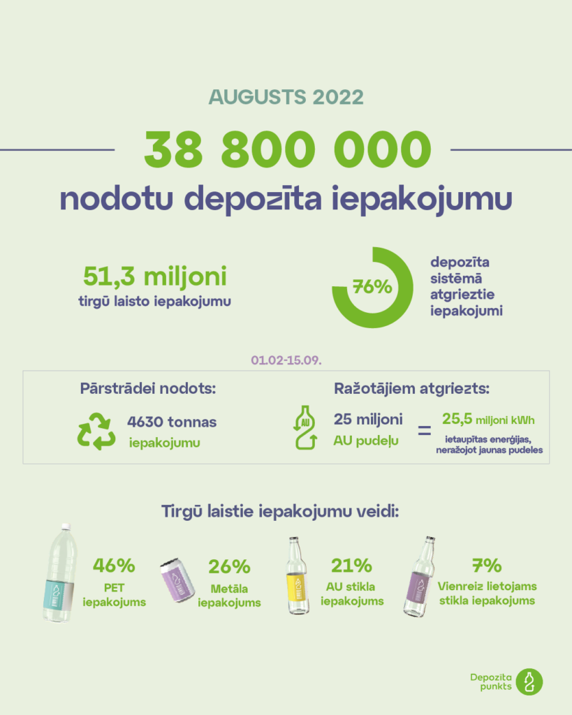 Augusta ietvaros tirgū laisti 51,3 miljoni depozīta iepakojumu, bet depozīta punktos atgriezti 38,8 miljoni tukšo iepakojumu – tādējādi atgriezti 76% no pagājušajā mēnesī pārdotajiem depozīta iepakojumiem. Līdztekus augustā sasniegts arī rekordliels nodoto iepakojumu skaits vienas dienas laikā, kad iedzīvotāji depozīta punktos nodeva vairāk nekā 1 600 000 tukšo iepakojumu.