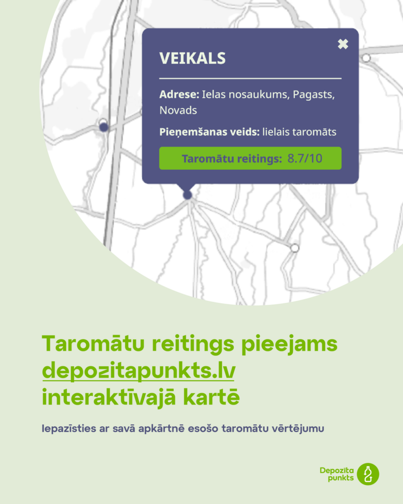Tuvojoties vasaras sezonai – aktīvākajam dzērienu patēriņa periodam gadā, – SIA “Depozīta Iepakojuma Operators” (DIO) ikvienam interesentam piedāvā iespēju iepazīties ar taromātu reitingu. Tagad, izmantojot www.depozitapunkts.lv interaktīvo karti, iedzīvotāji varēs redzēt ne tikai taromāta atrašanās vietu, bet arī informāciju par iepakojumu pieņemšanas veidu un taromāta reitingu. Reitings tiks noteikts 10 punktu skalā un atjaunots reizi mēnesī.