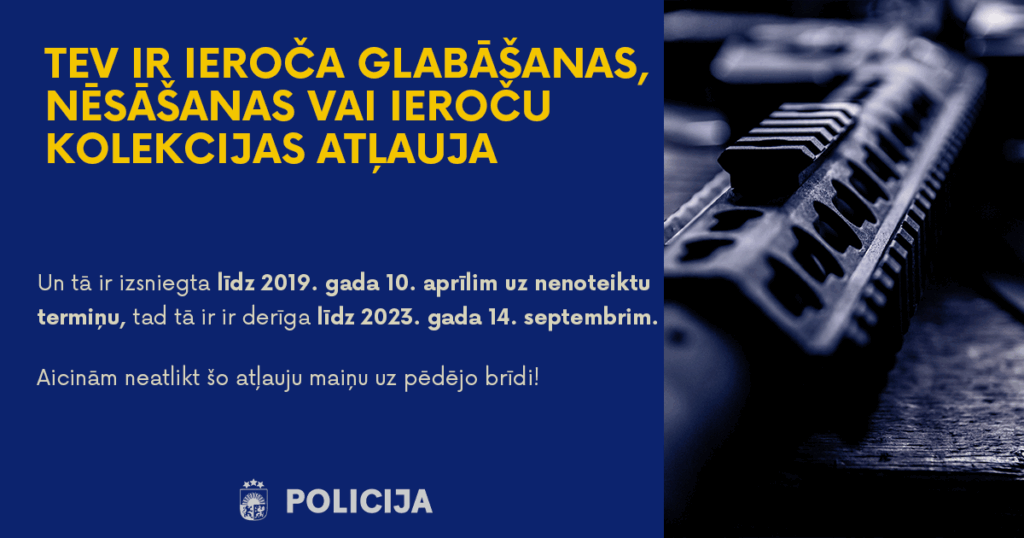 Fiziska persona var iesniegt iesniegumu par ieroča glabāšanas, nēsāšanas vai kolekcijas atļaujas termiņa pagarināšanu jebkurā personai piemērotā laikā līdz šī gada 14. septembrim un tajā Valsts policijas struktūrvienībā, kurā ierocis reģistrēts.