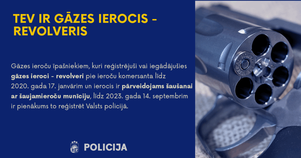 Tāpat Valsts policija informē gāzes ieroču īpašniekus, ka Eiropas Savienības ieroču aprites tiesiskais regulējums un Ieroču aprites likuma Pārejas noteikumu 12., 14. un 15. punktā noteikts, ka gāzes ieroči (revolveri), kuri reģistrēti vai iegādāti pie ieroču komersanta līdz 2020. gada 17. janvārim, saskaņā ar ieroču aprites tiesisko regulējumu tiek atzīti par pārveidojamiem šaušanai ar šaujamieroču munīciju. Ņemot vērā minēto, Ieroču aprites likuma 5. panta ceturtā daļa uzskata attiecīgus gāzes ieročus (revolverus) par B kategorijas šaujamieročiem un atkarībā no to darbības principa klasificē atbilstošā B kategorijas apakšgrupā.