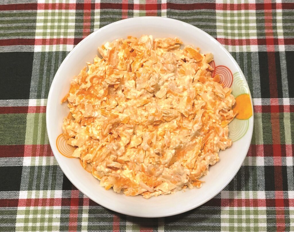 Nomizoju un uz rupjās rīves sarīvēju palielu burkānu. Sarīvēju arī nomizotu ‘Antonovkas’ ābolu bez serdes un sēklām. To vēl pārslacīju ar citrona sulu, lai nebrūnē. Bļodā tiem pievienoju apmēram puspaciņu biezpiena, spiedē sasmalcinātu vismaz vienu ķiploka daiviņu un visu samaisīju ar nelielu daudzumu skābā krējuma. Sastāvdaļu proporcijas un piena produktu tauku saturs – pēc pašu izvēles. Gatavs! Sāli te piemest vai arī ne – tas jau pēc garšas.