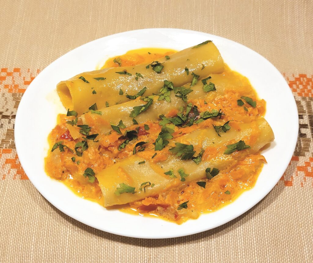 IDEJU šim ēdienam nejauši ieraudzīju videorullītī “Facebook” vietnē. Kanelonus jeb cilindriska veida pildītus makaronus vēl līdz šim nebiju gatavojusi, jo tas šķita diezgan laikietilpīgi. Taču šis variants “uzrunāja”. Maltajai cūkgaļai pievienoju nedaudz rīvēta siera, maltus piparus, paprikas, kā arī ķiploku pulveri, sāls vietā pielēju nedaudz sojas mērces, pieliku arī mazliet majonēzes – “uz aci”. Masu labi sastrādāju un pildīju makaronu “trubiņās”. Dziļajā pannā nelielā augu eļļas daudzumā apcepu sagrieztus sīpolus, pievienoju uz rupjās rīves sarīvētus burkānus un gabaliņos sagrieztus tomātus. Visu pacepu, tad pieliku skābo krējumu un nedaudz tomātu mērces, atkal visu kopā apcepu. Pēc tam pannā kārtoju arī pildītos kanelonus, pārlēju no koncentrāta pagatavotu buljonu tā, lai tie būtu nosegti, un zem vāka visu sautēju vismaz minūtes 20. Gatavo ēdienu pārkaisīju ar sasmalcinātām pētersīļu lapiņām.