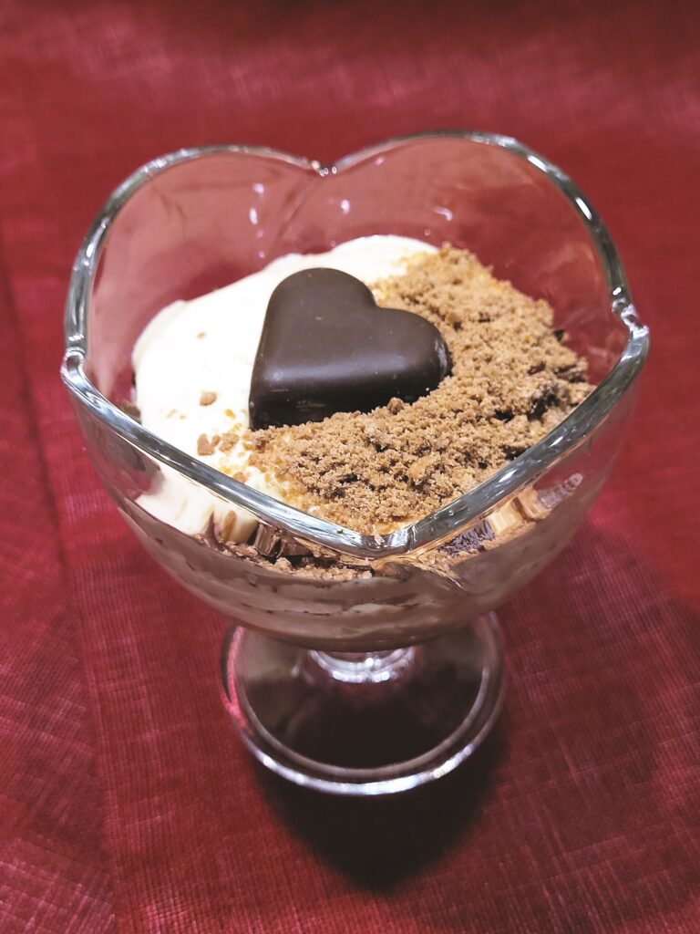 SALDUMMĪĻIEM noteikti garšos šāds vienkārši pagatavojams kārtojums. Skābajam krējumam pievienoju vārīto iebiezināto pienu ar cukuru un labi samaisīju, lai veidojas viendabīgs krēms. Šokolādes cepumus salauzīju nelielos gabaliņos. Sīki sakapāju daļu piena šokolādes tāfelītes. Nu stikla trauciņos varēju kārtot vispirms krējuma krēmu, tad salauzītos brūnos cepumus, pēc tam atkal krēmu, virs tā šokolādes skaidiņas un atkal mazliet krēma. Virsū uzkaisīju saberztus cepumus un uzliku šokolādes rotājumu. Kārtas, protams, varam mainīt atkarībā no izvēlētajiem trauciņiem, kā arī vienai pat izmantot kādu skābenu ogu ievārījumu vai mērci. Desertu uz dažām stundām ievietoju ledusskapī. Gardumu varam pagatavot arī iepriekšējā dienā un baudīt nākamajā.