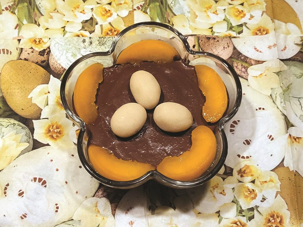 ŠĀDU gardumu vēlējos nogaršot jau ap ziemas saulgriežiem, kad atradu šo ideju. Nu jau klāt pavasaris, tādēļ īstais laiks no saulainajiem persikiem šo šokolādīgo kārumu pagatavot. Konservēto persiku pusītes notecināju, sagriezu gabaliņos, liku blendera krūzē un pielēju karoti sīrupa. Izkausēju 87 procentīgo tumšo šokolādi, mazliet padzesēju, tad pielēju persikiem un kopā sablendēju līdz krēmīgai masai. To lēju saldēdiena trauciņos un uz pāris stundām ievietoju ledusskapī sastingšanai. Tad jau varēju izrotāt ar persiku šķēlītēm un marcipāna oliņām.