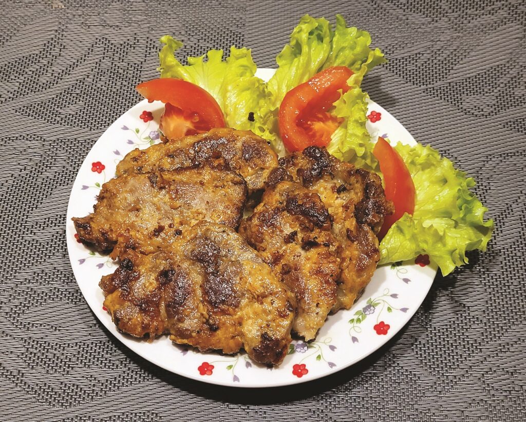 JA GAĻU šādi iemarinēsim jau iepriekš, to vēlāk atliks tikai izcept. Cūkgaļas kakla karbonādi – bija apmēram 400 gramu, lai gan no šīm izejvielām marinādes pietiktu arī lielākam gaļas gabalam – sagriezu apmēram centimetru biezās šķēlēs un zem pārtikas plēvītes izklapēju no abām pusēm. Tās no abām pusēm apkaisīju ar sāli un pagatavoju marinādi. Bļodā iesitu olas, tās mazliet saklapēju, piespiedu pāris ķiploka daiviņas, pierīvēju nomizotu sīpolu, pieliku majonēzi, pielēju sojas mērci un pievienoju sinepes – “uz aci”, cik šķita nepieciešams. Piemalu arī melnos piparus. Visu sajaucu. Atsevišķi nelielā daudzumā ūdens istabas temperatūrā izšķīdināju cieti un iemaisīju pie pārējām sastāvdaļām. Pagatavotajā marinādē liku izklapētos gaļas gabaliņus un atstāju ievilkties vismaz divas stundas. Intensīvāku garšu gaļa iegūs, atstāta tajā pa nakti. Gaļu cepu no abām pusēm pannā ar uzkarsētu augu eļļu un pirms gatavības to vēl pasautēju zem vāka.
