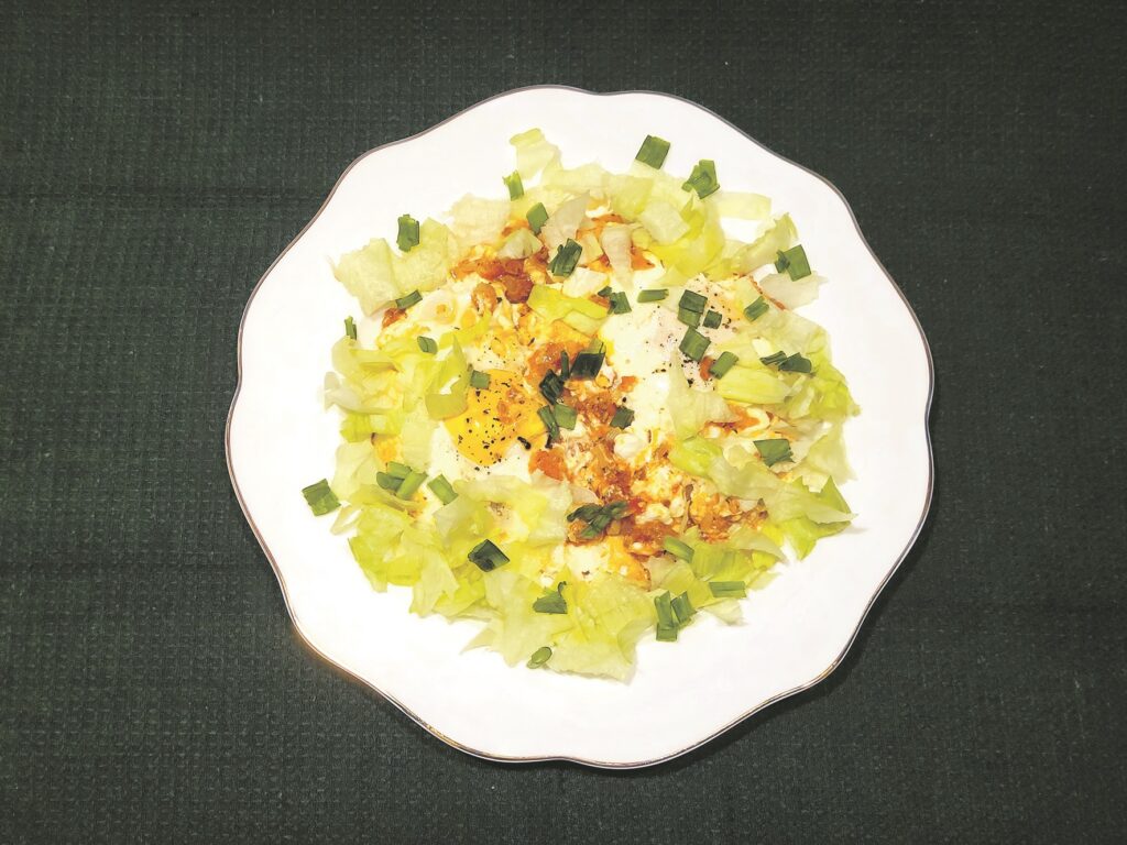 DER ATLICINĀT laiku, lai brokastīm pagatavotu šādu garšīgu ēdienu. Vispirms nomazgāju un apsusināju tomātu, sīpolu lociņus un salātlapas. Nomizotu sīpolu un ķiploka daiviņu sasmalcināju un apcepu pannā ar uzkarsētu eļļu, piekaisot sāli, maltus melnos piparus un sauso garšaugu maisījumu. Tomātu sarīvēju uz rupjās rīves, tādējādi atbrīvojoties no mizas. Pēc tam biezeni pievienoju dārzeņiem, samaisīju un visu kopā vēl nedaudz pacepu. Tad pannā uz apcepto sīpolu un tomātu mērces uzmanīgi iesitu divas olas, pāri vēl izkārtoju gabaliņos sagrieztu fetas sieru un uzliku pannai vāku. Uz nelielas uguns sautēju apmēram desmit minūtes, līdz olas šķita gatavas. Tikmēr sasmalcināju sīpolu lociņus un ledus salātu lapas un pēc tam pārkaisīju gatavajam ēdienam.