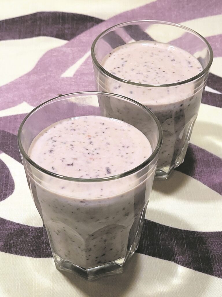 IDEJU par šādu veselīgu augļu un ogu salikumu kopā ar auzu pārslām un čijas sēklām atradusi, atkal nobaudīju garšīgu un citādu smūtiju jeb pudiņu. Grieķu jogurtu, cik nu šķita nepieciešams izvēlētajam ogu daudzumam, samaisīju ar čijas sēklām un atstāju mazliet uzbriest. Nomazgāju un apsusināju banānu un ogas. Tā kā kazenes nebija pieejamas, to vietā izlīdzējos ar svaigām zemenēm. Blendera krūzē iebēru mazo paciņu ātri pagatavojamo auzu pārslu, sagriezu gabaliņos banānu, pieliku lielogu mellenes, jogurta un čijas sēklu maisījumu un virsū – gabaliņos sagrieztas svaigas zemenes. Visu kopā sablendēju un salēju glāzēs. Baudīt šo veselīgo gardumu bez pievienota cukura varam jau uzreiz, bet, ja to vēl atstāsim ledusskapī, čijas sēklas labāk uzbriedīs un pudiņš kļūs biezāks.