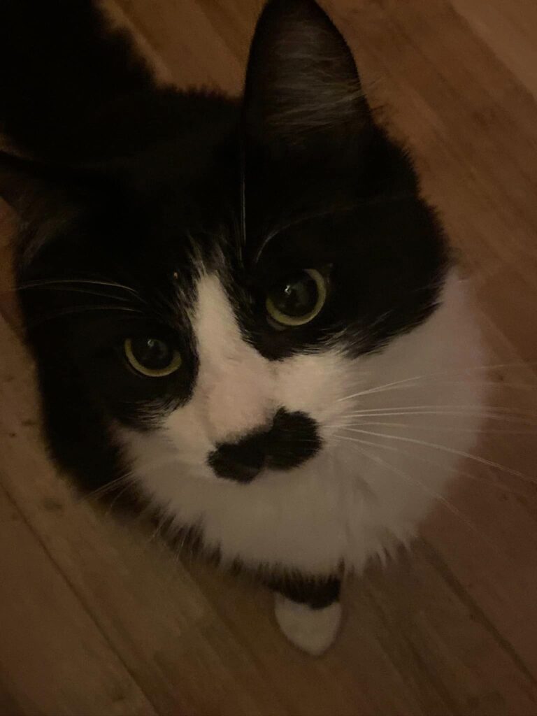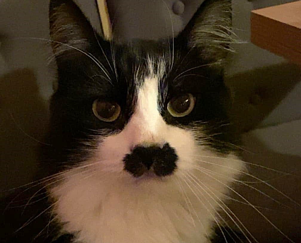 Pazīmes: melns ar baltu kakliņu, ķepas baltas, gara, spalvaina aste. Zem deguntiņa melns pleķītis, kas atgādina ūsiņas. Tālr. +371 20212879.