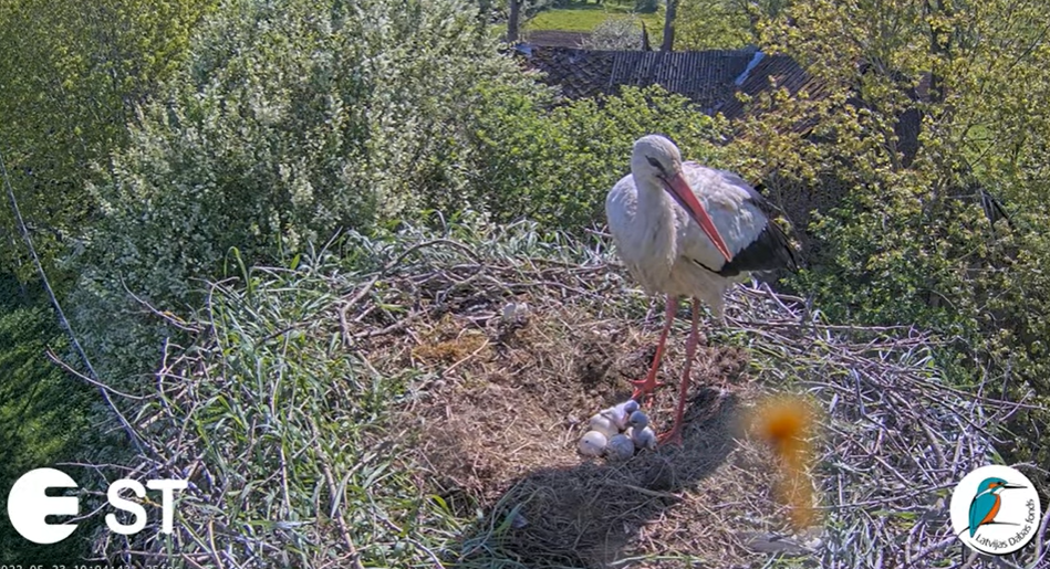 Video tiešraidē redzamais balto stārķu pāris, kas ligzdo uz viena no AS “Sadales tīkls” elektroapgādes balstiem, sagaidījis pirmos mazuļus. Pirmā ola šķīlusies svētdien, 22. maija, rīta pusē, bet tās pašas dienas vakarā gaismu ieraudzījis arī otrs stārķēns. Kopumā ligzdā perētas piecas olas, un sagaidāms, ka turpmākajās dienās izšķilsies arī atlikušās trīs.