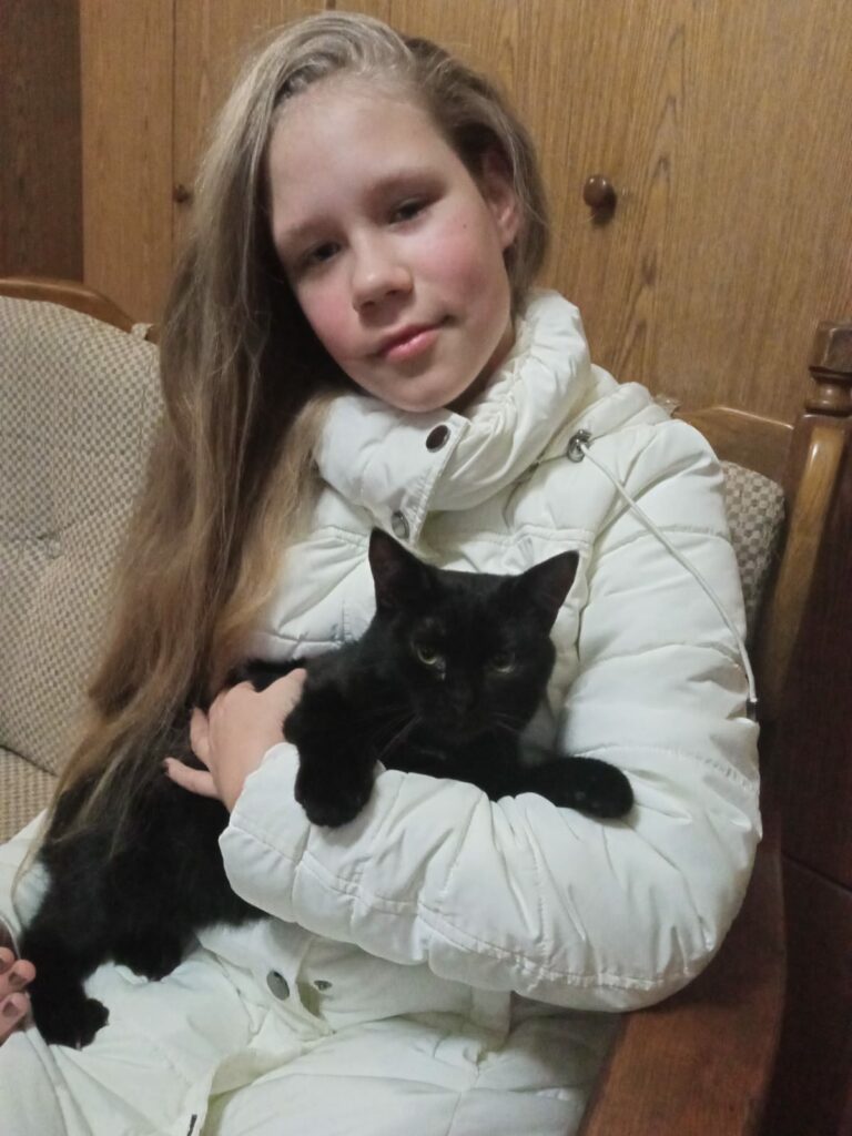 Lūk, ko viņa raksta: “Es un mans kaķis Melnis dzīvojam audžuģimenē, kurai izveidots mini eksotisko putnu zoodārzs. Man ir brālis, kurš pieskata divas jūrascūciņas. Vēl trīs audžumāsas rūpējas par bruņurupučiem, pāviem, paipalām. Man radās doma, ka putnus varētu pieskatīt tieši melns kaķis. Lai gan citi saka, ka melns kaķis nes nelaimi, es gribu apgalvot pretējo. Man uzdāvinātais Melnis ģimenē ienes gan jautrību, gan nekārtību, gan uzmanību, gan rūpes. Es viņu mācu sadzīvot ar putniem (paipalām, pāviem, strausiem). Kustīgu putnu vērošana Melnim padodas grūti. Viņš metas viņu apskaušanā, ķeršanā, baidīšanā. Man tas iemāca pacietību, mīlestību, gudrību, laimi un prieku. Melnis ir zinātkārs, tīrīgs (bieži mazgājas), nekad nepārskrien pāri ceļam, bet, kad gadās kāda ceļā, tad vienmēr nes veiksmi. Pavada katru rītu mani uz skolu, tad diena veiksmīga, bet, kad rīta cēlienu noguļ, man vienmēr gadās kāda ķibele. Tāpēc uzskatu, ka melnam kaķim būtu jābūt katrā mājā. Es vēlētos iegādāties baltu kaķi un salīdzināt. Ceru, ka mana vēlēšanās piepildīsies. Tad es jūsu laikrakstam “Ziemeļlatvija” atsūtīšu savu pētījumu, kādas krāsas kaķis ir jālolo mājās. Savu Melni fotografēju bieži, lai noteiktu viņa raksturu un redzētu, kā viņš izaug.