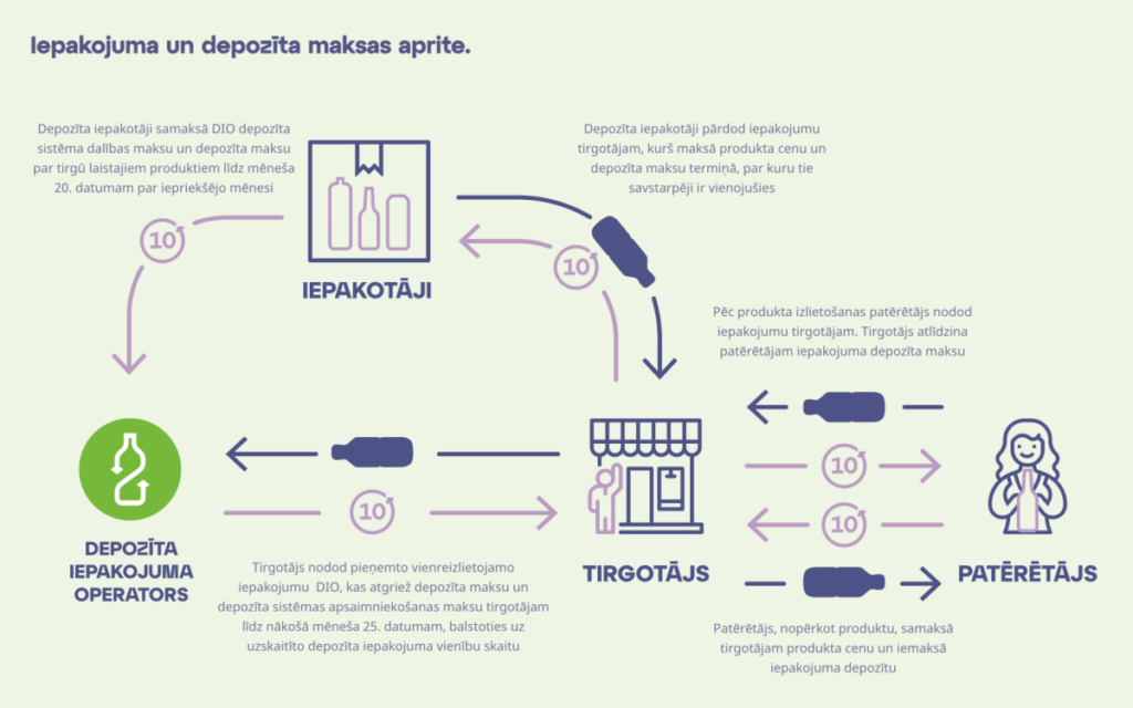 Depozīta maksai jāmēro garš ceļš cauri visām dzērienu apritē iesaistītajām pusēm, lai cikla noslēgumā tā nonāktu atpakaļ patērētāja maciņā. Vispirms, saražojot dzērienus depozīta iepakojumā un laižot tos Latvijas tirgū, ražotāji iemaksā depozīta sistēmas operatoram depozīta maksu par katru tirgū laisto depozīta iepakojumu. Produktam tālāk nonākot veikalu plauktos, tirgotājs samaksā depozīta maksu ražotājam par katru iegādāto depozīta iepakojuma vienību. Pēc tam tirgotājs ražotājam samaksāto depozīta maksu saņem atpakaļ, pārdodot dzērienu pircējam, savukārt galalietotājs saņem atpakaļ iemaksāto depozīta maksu no tirgotāja tad, kad nodod tukšo iepakojumu depozīta sistēmā.