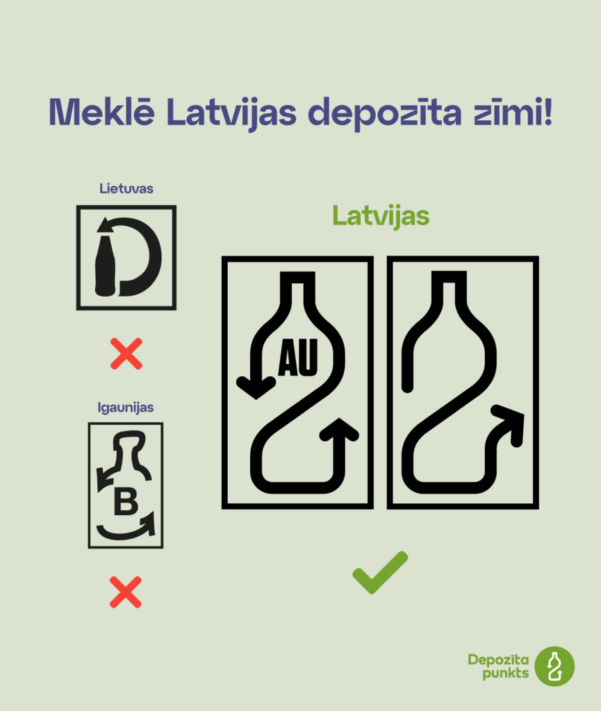 Ņemot vērā, ka uz iepakojuma etiķetes var būt izvietotas arī kaimiņvalstu depozīta zīmes, pirms dzēriena iegādes aicinām rūpīgi apskatīt etiķeti – ja uz tās atrodas Latvijas depozīta zīme, par produktu tiek iekasēta depozīta maksa un to pēcāk ir iespējams nodot atpakaļ depozīta sistēmā.
