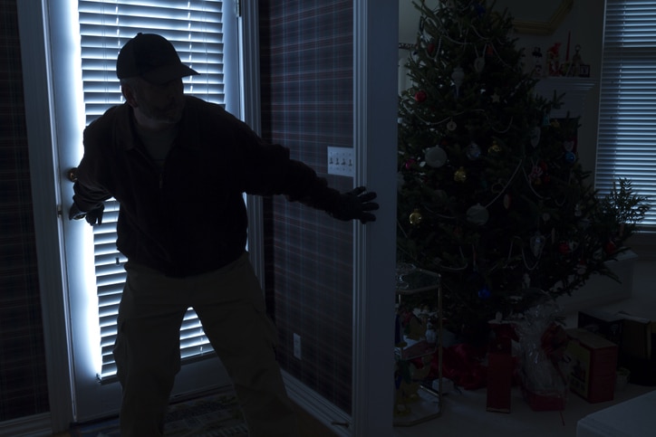 This photo illustrates a burglary or thief breaking into a home at night through a back door during the Christmas Holiday Season. View from inside the residence.