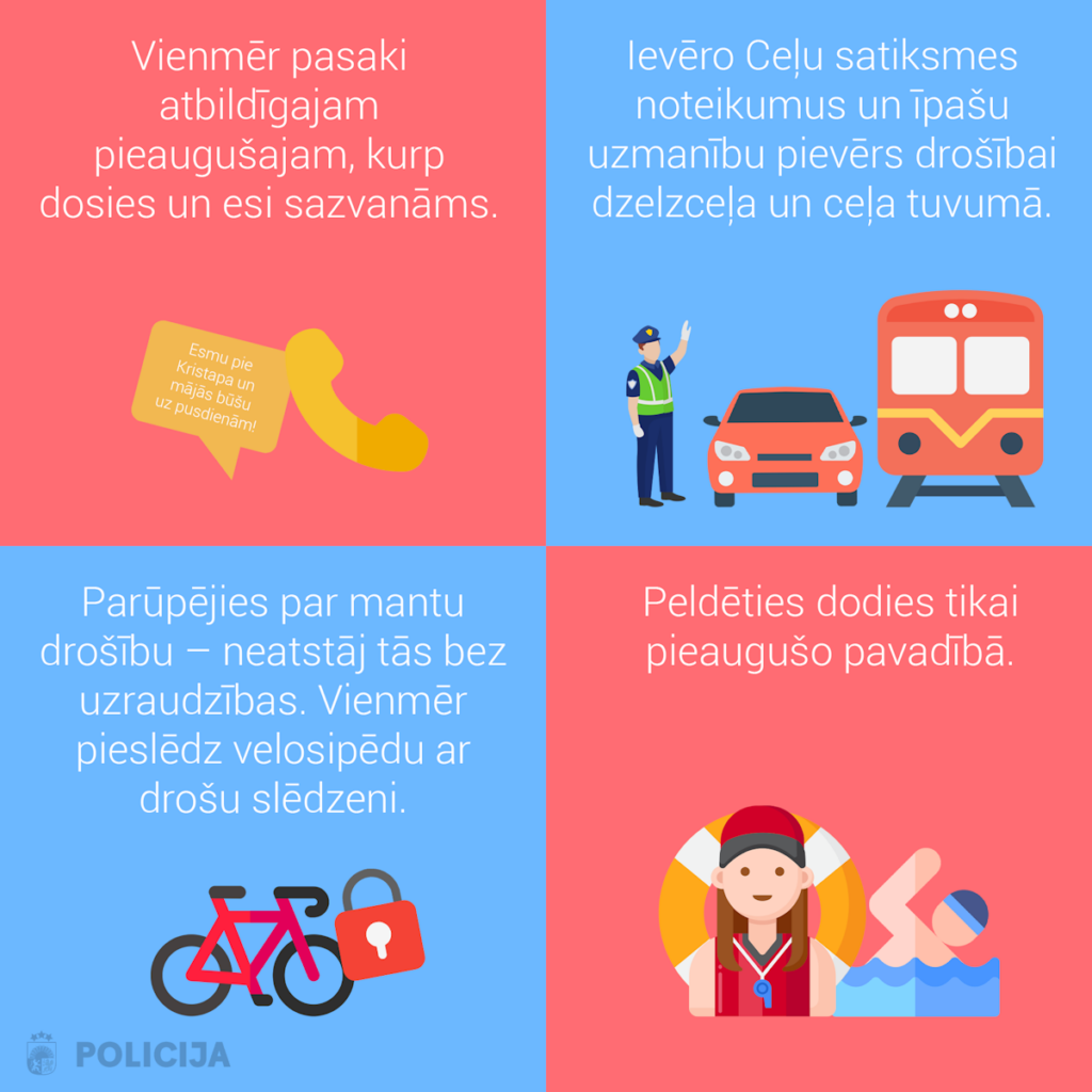 1. jūnijā daudziem skolēniem sākas ilgi gaidītās vasaras brīvdienas un, lai, baudot vasaras atpūtu un dažādas aktivitātes, nebūtu jāsaskaras ar nepatīkamiem starpgadījumiem, Valsts policija aicina vecākiem ar savām atvasēm rūpīgi pārrunāt dažādus jautājumus par drošību vasarā. Tāpat Valsts policija ir arī sagatavojusi vairākus drošības nosacījumus, kas jāņem vērā ikvienam bērnam.