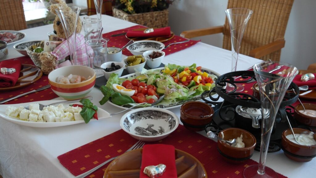 - Izmantot rotējošā galda plātni. Uz tā var salikt salīdzinoši daudz un daudzveidīgu ēdienu, kas pie galda sēdošajos rada psiholoģisku efektu – ēdiens tepat vien ir, ērti pieejams un paņemams. Tādēļ varēšu paņemt papildu porciju tad, kad vēlēšos, nevis tagad, kad blakus sēdošais ir pasniedzis šķīvi, kuru vajadzētu ātrāk iztukšot, lai uz svētku galda atbrīvotu vietu nākamajiem ēdieniem.