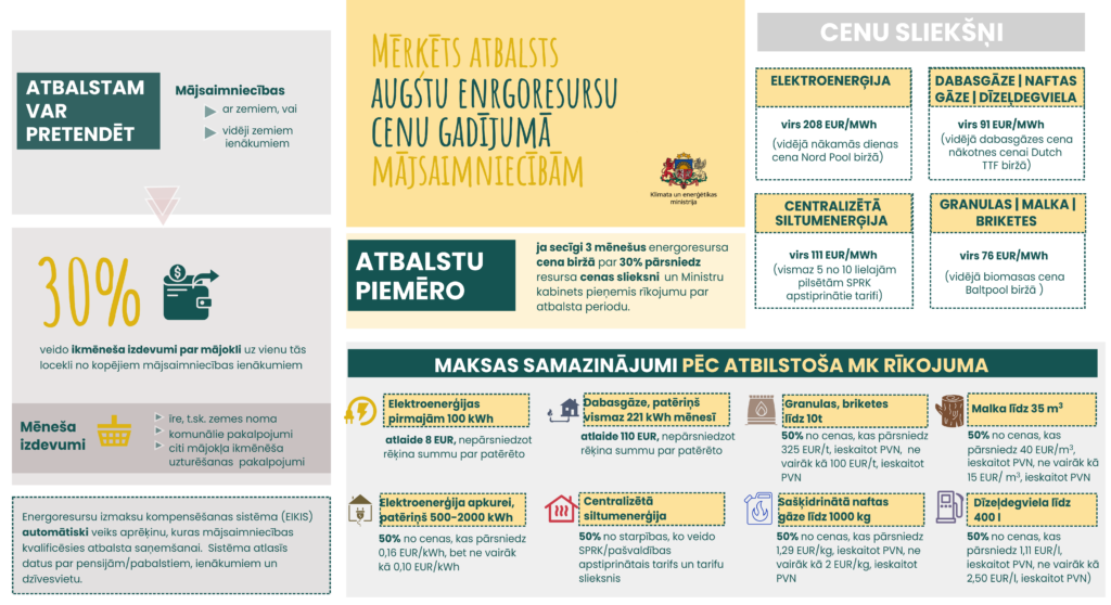 Otrdien, 3.septembrī, Ministru kabinets (MK) apstiprināja Klimata un enerģētikas ministrijas (KEM) izstrādātos noteikumus, kas nosaka, kuros gadījumos un, cik lielu valsts atbalstu saņem mājsaimniecības ārkārtēji augsta energoresursu cenu kāpuma gadījumā. Šādās situācijās atbalstu saņems mājsaimniecības ar zemu un vidēji zemu ienākumu līmeni.