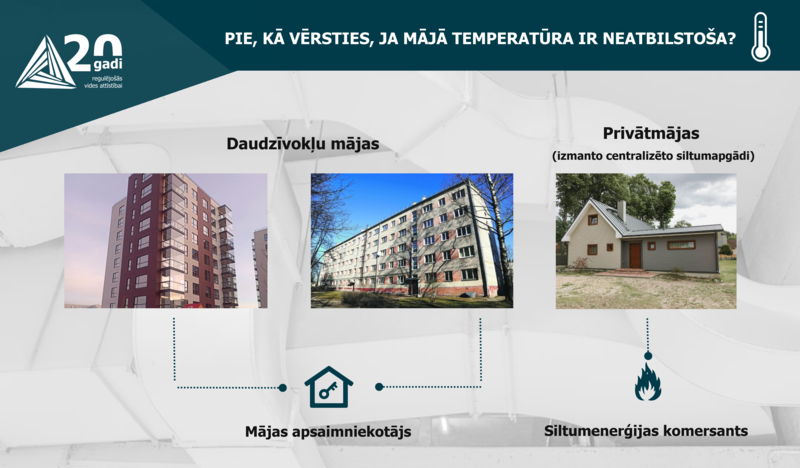 Svarīgi! Atjaunojamās un pārbūvējamās dzīvojamās ēkās dzīvojamā telpā un guļamistabā apkures sistēmai jānodrošina minimālā temperatūra – 180 C, bet vannas istabā – 250 C. Savukārt faktisko uzturamo temperatūru daudzdzīvokļu mājas iekšienē (neatkarīgi no tā, kad māja ir būvēta) nosaka mājas iedzīvotāji. Par neatbilstošu temperatūru mājas iekšienē daudzdzīvokļu mājas iedzīvotāji informē mājas apsaimniekotāju, bet privātmāju iedzīvotāji – komersantu, kas piegādā siltumenerģiju.