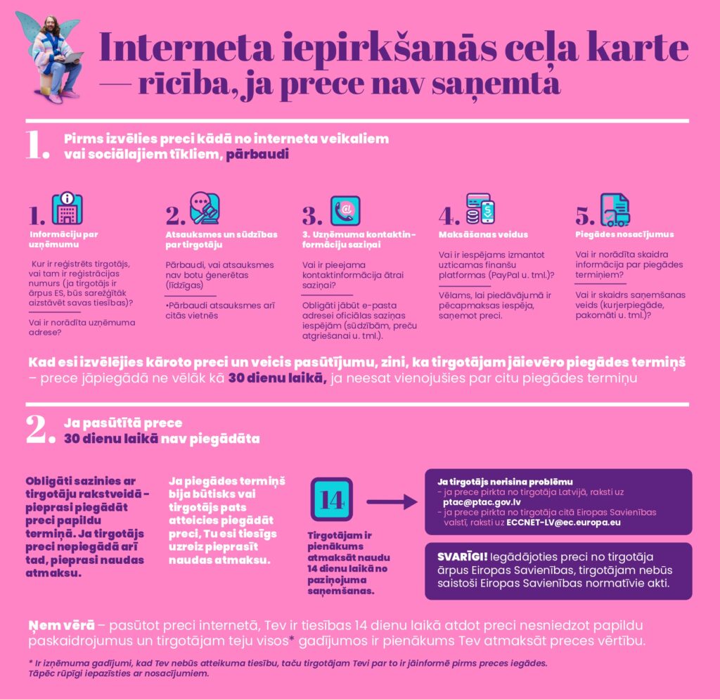 Iepērkoties interneta veikalos vai sociālajos tīklos, cilvēki nereti sastopas ar situācijām, ka iegādātā prece ir neatbilstoša vai, sliktākajā gadījumā, pircējs pat nesaņem kāroto pirkumu. Ko darīt? Lai izvairītos no šādiem nepatīkamiem pārsteigumiem, ir svarīgi zināt, kā rīkoties un kādas ir tavas patērētāja tiesības. Patērētāju tiesību aizsardzības centrs (PTAC) apkopojis pamatinformāciju un norādes, kas jādara, ja radušās problēmas ar internetā pirktu preci.