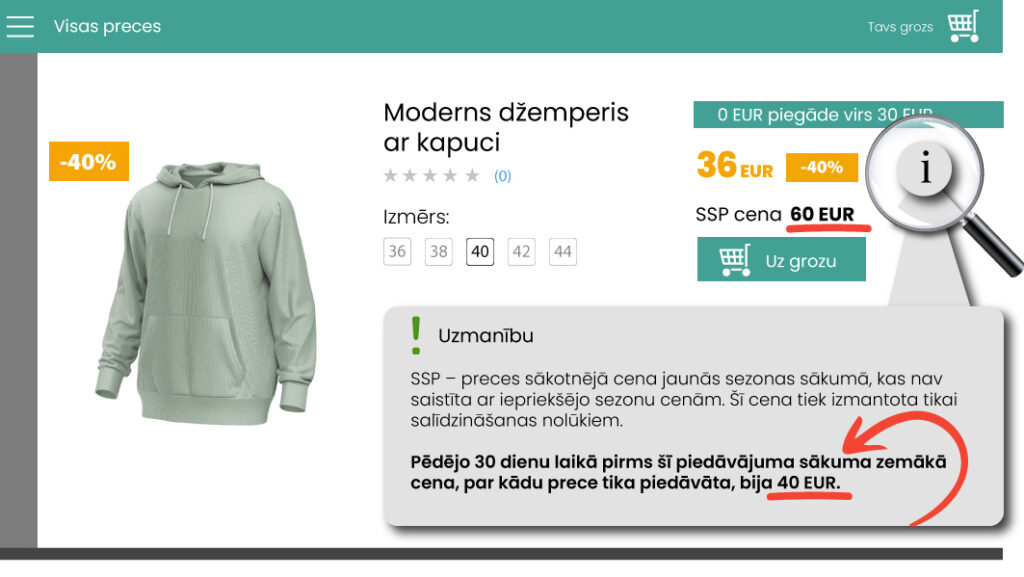 • Nepareiza atlaižu piemērošana – atlaide netiek rēķināta no 30 dienu zemākās cenas, norādīta nepatiesa 30 dienu zemākā cena.