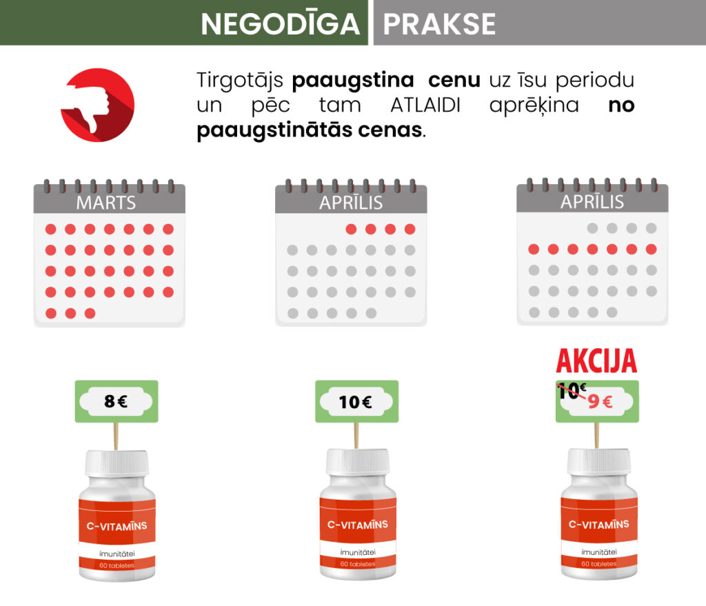 • Cenu manipulācijas – preces cenas mākslīgi paaugstinātas pirms atlaides piemērošanas.