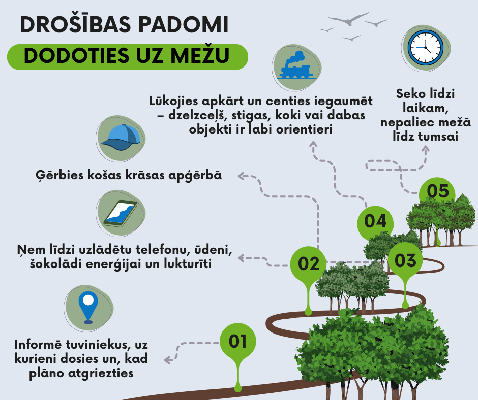 • Mežā nedodieties vienatnē, lai nepieciešamības gadījumā otrs cilvēks varētu palīdzēt;