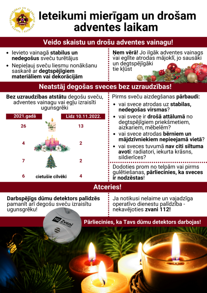 Pērn ugunsdzēsēji glābēji dzēsa 37 ugunsgrēkus, kuri, visticamāk, izcēlās adventes vainagā vai Ziemassvētku eglītē ievietotas degošas sveces dēļ, vai bez uzraudzības atstātām degošām svecēm. Šogad līdz 10.novembrim reģistrēti jau 17 šādi ugunsgrēki. Ik gadu šādos ugunsgrēkos cieš cilvēki – šogad cieta četri cilvēki, bet 2021.gadā kopumā seši.