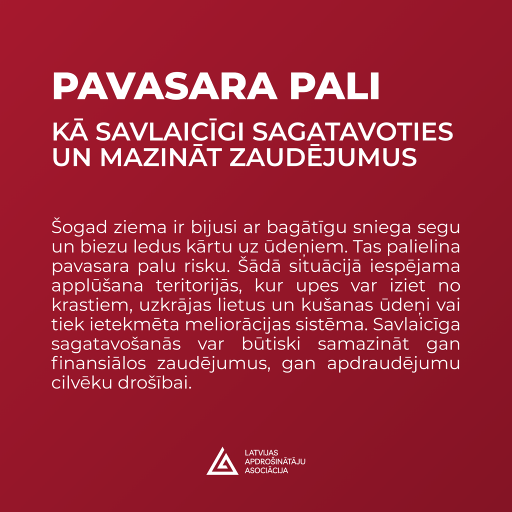Bagātīga sniega sega, tā strauja kušana un ledus uz upēm šogad būtiski palielina pavasara palu risku. Šādos apstākļos iespējama teritoriju applūšana vietās, kur upes var iziet no krastiem, uzkrājas lietus un kušanas ūdeņi vai tiek ietekmētas meliorācijas sistēmas. Savlaicīga sagatavošanās var būtiski samazināt gan finansiālos zaudējumus, gan apdraudējumu cilvēku drošībai. Vienlaikus pēdējo gadu dati skaidri apliecina, ka dabas stihiju radītie zaudējumi pieaug, un klimata pārmaiņas vairs nav abstrakts nākotnes risks, bet ikdienas realitāte.