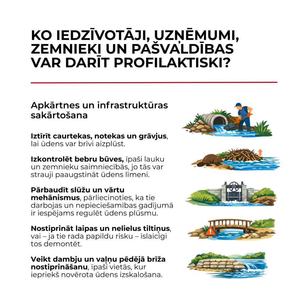 - Iztīrīt caurtekas, notekas un grāvjus, lai ūdens var brīvi aizplūst.