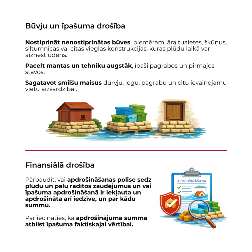 - Pārbaudīt, vai apdrošināšanas polise sedz plūdu un palu radītos zaudējumus un vai īpašuma apdrošināšanā ir iekļauta un apdrošināta arī iedzīve, un par kādu summu.