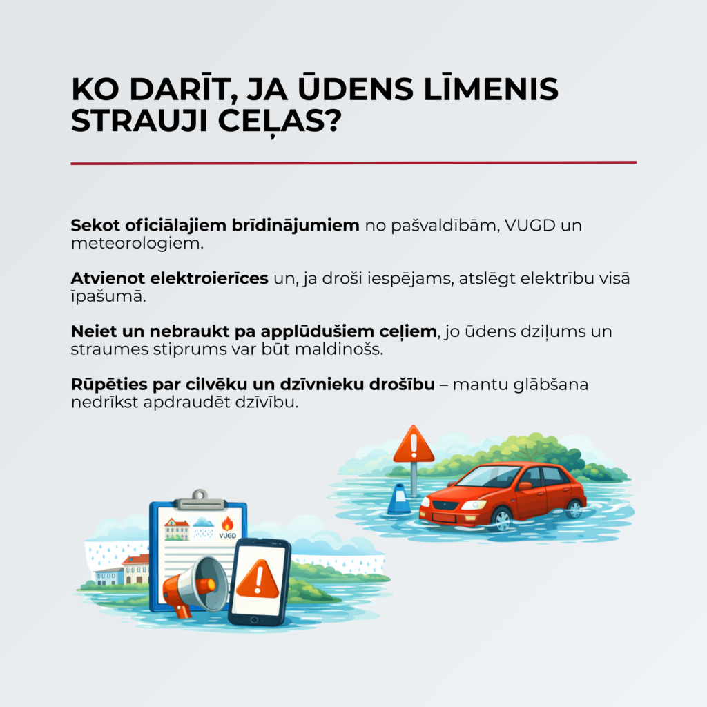 Paaugstināta riska apstākļos svarīgi sekot oficiālajiem brīdinājumiem, atvienot elektroierīces, nešķērsot applūdušus ceļus un primāri rūpēties par cilvēku un dzīvnieku drošību. Mantu glābšana nedrīkst apdraudēt dzīvību.
