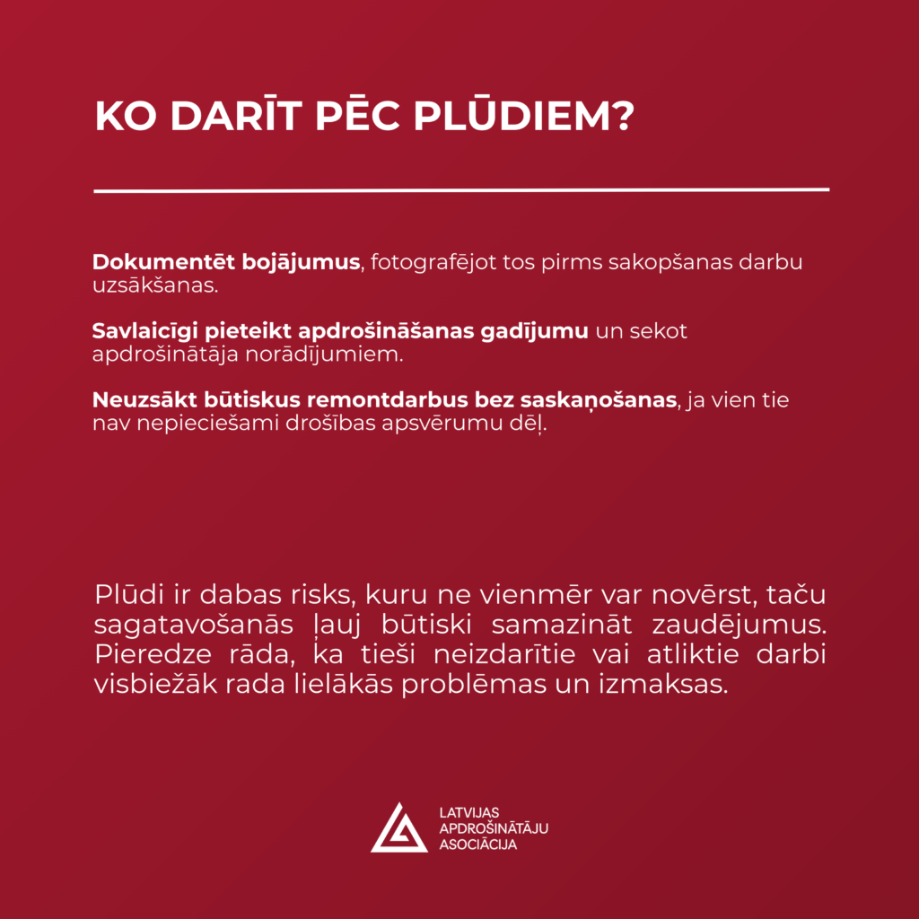 Pēc applūšanas būtiski dokumentēt bojājumus, savlaicīgi pieteikt apdrošināšanas gadījumu un neveikt būtiskus remontdarbus bez saskaņošanas ar apdrošinātāju, ja vien tas nav nepieciešams drošības dēļ.
