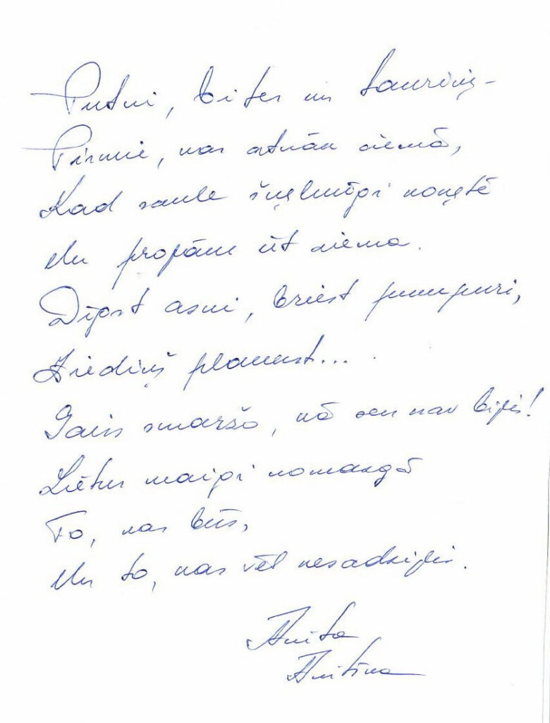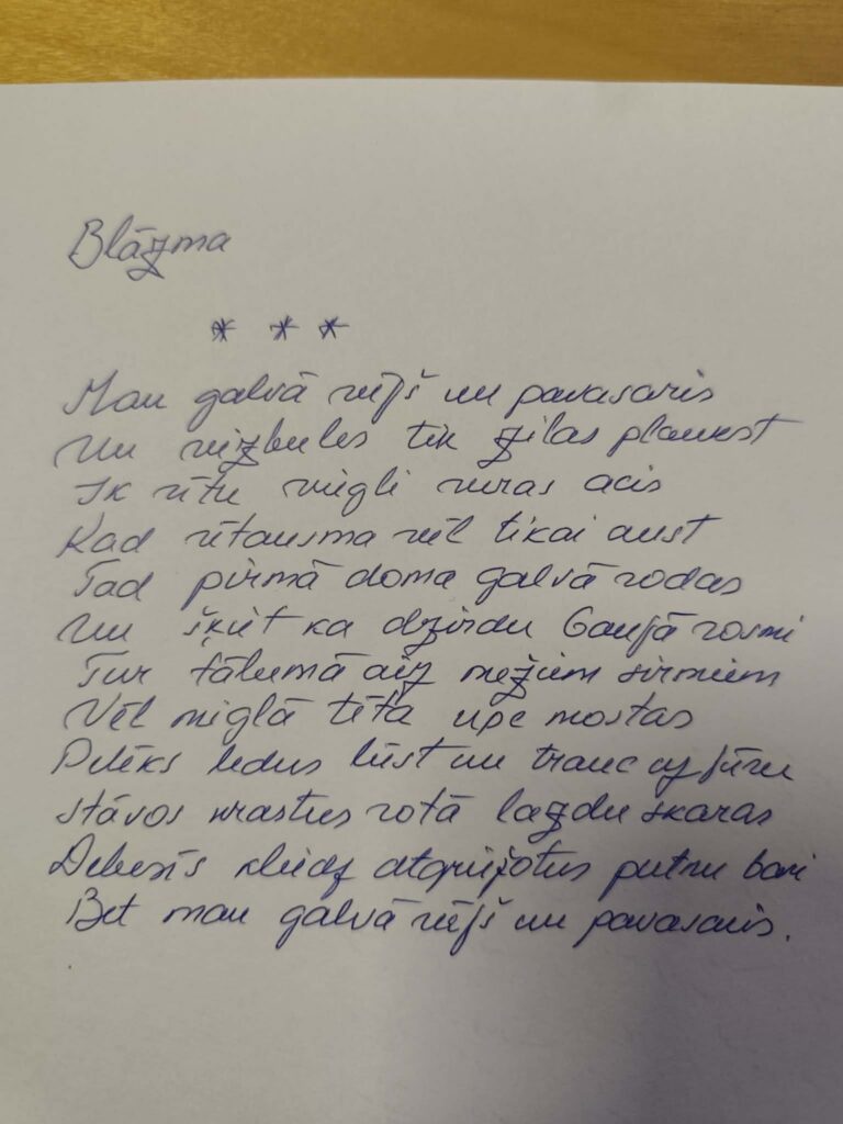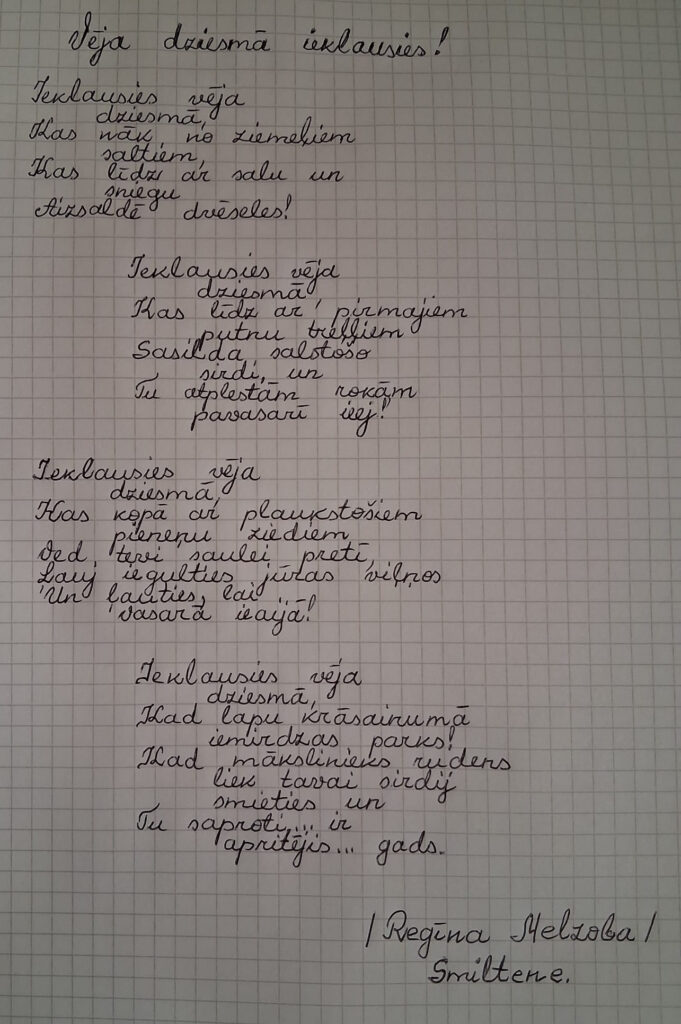Turpinās mūsu novadu dzejdaru dāvinājumi – ar roku rakstīti dzejoļi – jums, mīļie lasītāji, atsaucoties aicinājumam Pasaules dzejas dienā, kas bija 21. martā.