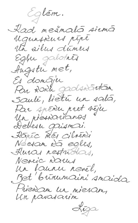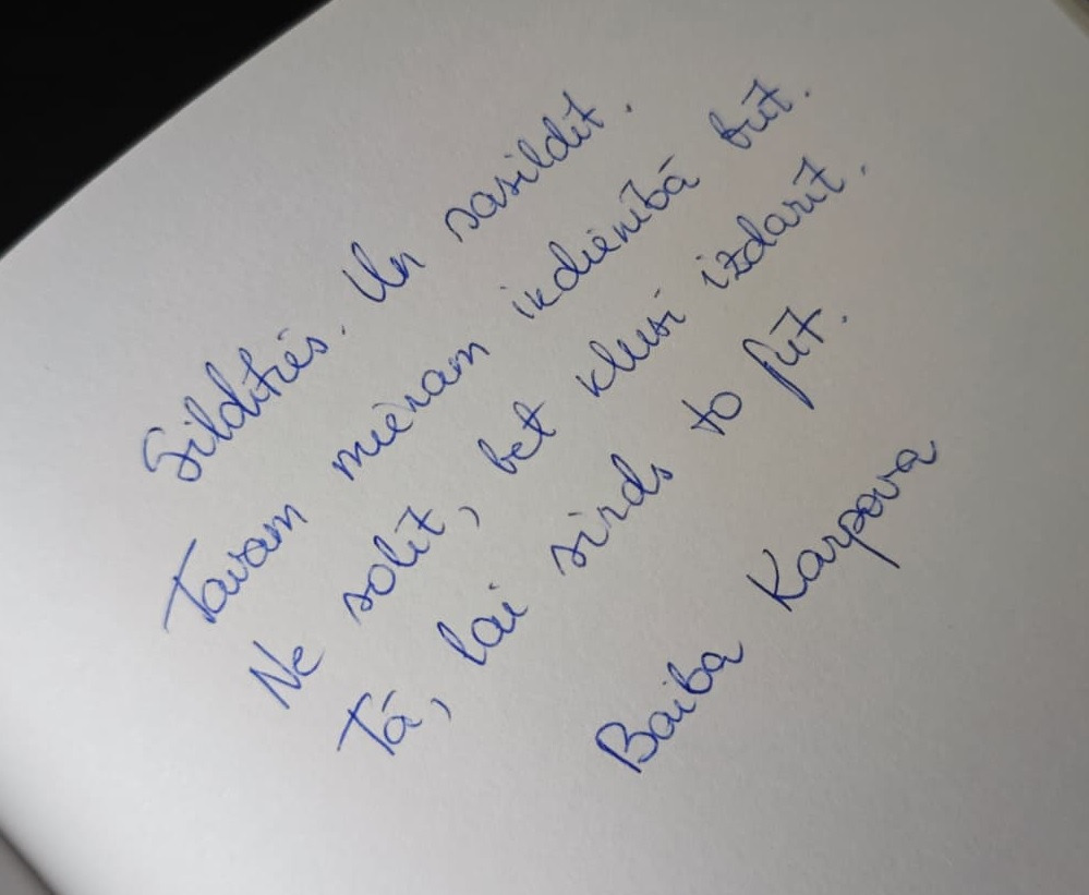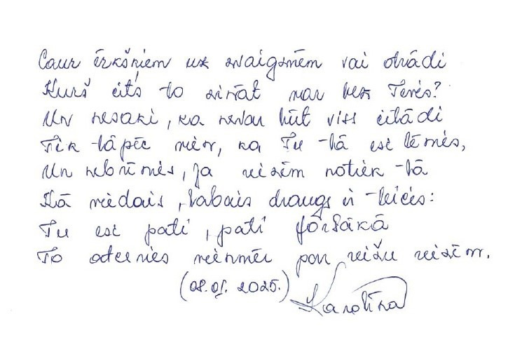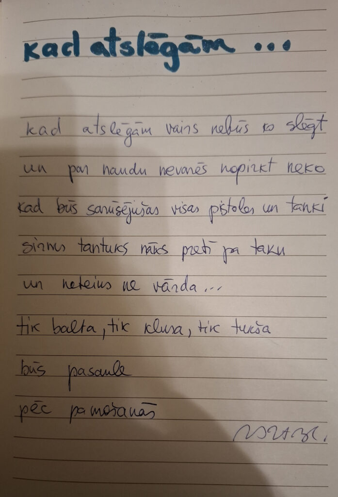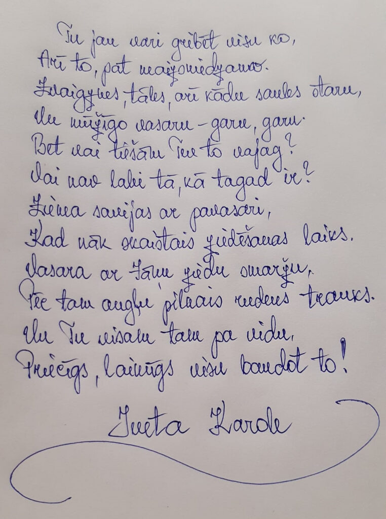 Bet jūs – vai uzdāvinājāt kādam ar savu roku rakstītu dzejoli? Kāda zināma dzejnieka vai varbūt paša sacerētu? Ja nē, to vēl var izdarīt, jo neba īpaša diena jāgaida, lai iepriecinātu kādu. Lai atgādinātu par sevi. Lai vienkārši būtu blakus. Ja ne citādi, tad ar roku rakstītos vārdos.