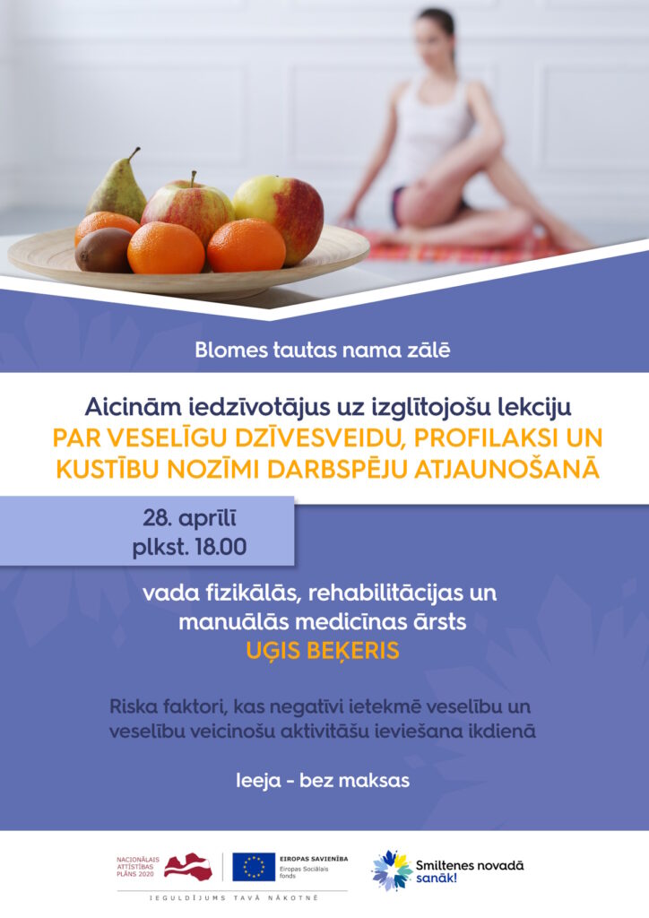 Aicinām iedzīvotājus izmantot iespēju, 2023. gada 28. aprīlī no pulksten 18.00 līdz 19.30 Blomes tautas nama zālē, Blomes pagastā, apmeklēt izglītojošu lekciju “Par veselīgu dzīvesveidu, profilaksi un kustību nozīmi darbaspēju atjaunošanā”, ko vadīs fizikālās, rehabilitācijas un manuālās medicīnas ārsts Uģis Beķeris. Ieeja – bez maksas.
