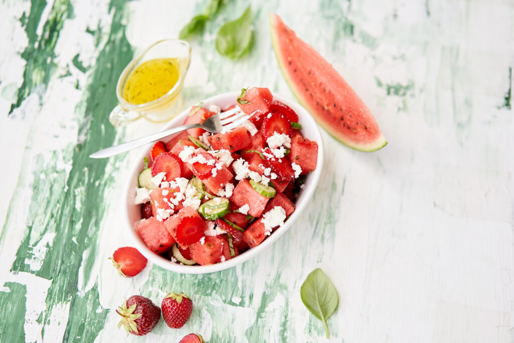 Arbūzu sagriez nelielos kubiņos, gurķus un ogas sagriež ripiņās, smalki sakapā bazilika lapiņas.