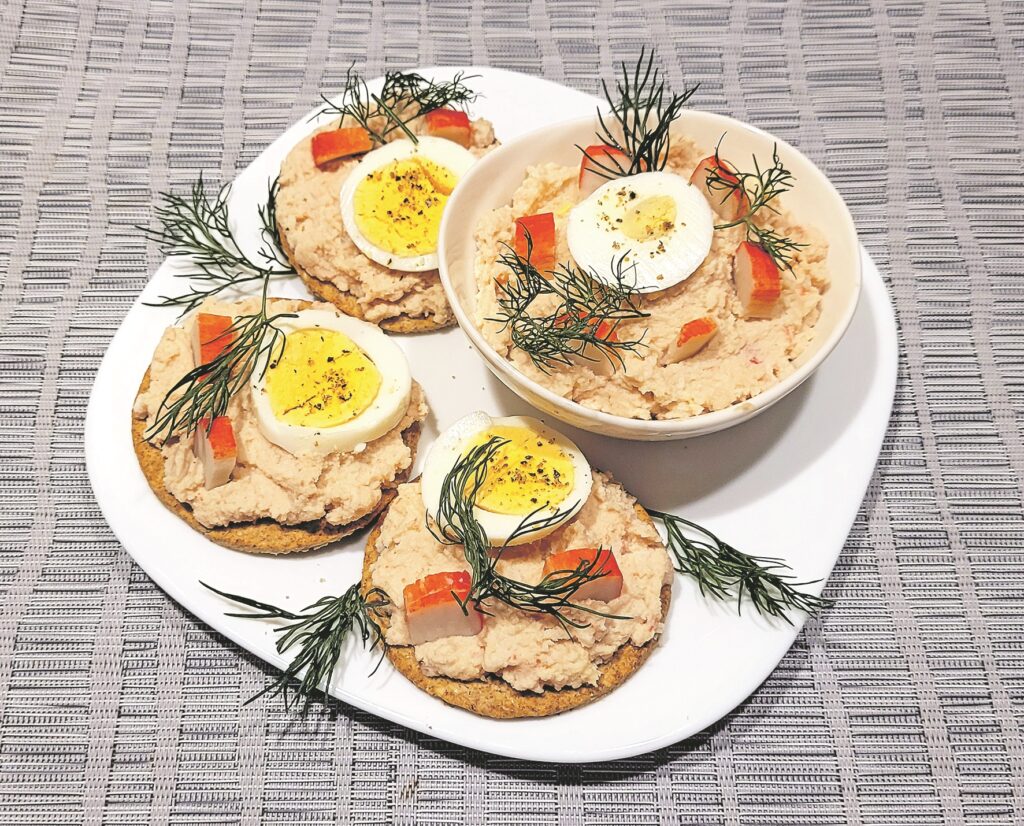 Krabju nūjiņas atbrīvoju no iepakojuma, sagriezu gabaliņos un kopā ar vārītām olām, anšoviem pēc garšas un majonēzi sablendēju viendabīgā masā.
