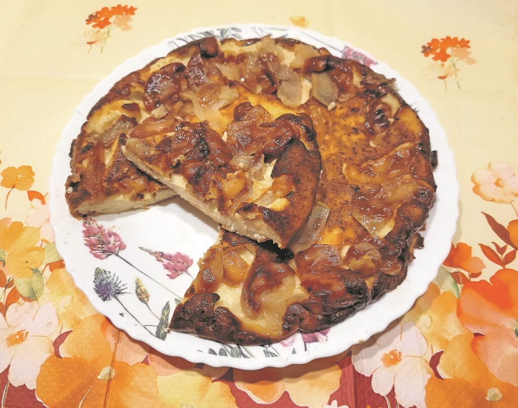 Mīklai sajaucu olas ar cukuru, piemetu sāli, piemaisīju biezpienu, skābo krējumu un izsijātus miltus. Pēc tam mīklu izlīdzināju veidnē pāri āboliem, paturēju uz plīts vēl 2 – 3 minūtes, tad ievietoju līdz 180 – 200 grādiem uzkarsētā cepeškrāsnī un cepu līdz zeltainai garoziņai. Gatavo sacepumu apvērsu uz šķīvja – ar āboliem uz augšu.