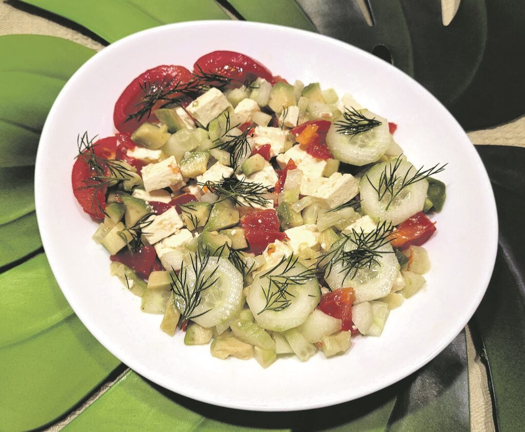 1 svaigs gurķis, ½ avokado, 2 tomāti, 100 gramu fetas siera, augu eļļa, citrona sula, šķipsniņa sāls, šķipsniņa cukura.
