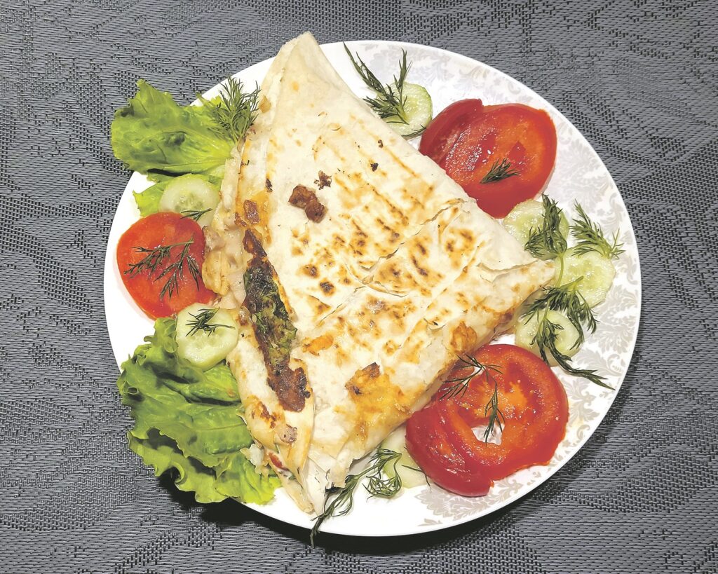 Piegriezto lavaša ripu pārsmērēju ar kausēto sieru, šoreiz bija ar baravikām. Tad lavašu iegriezu līdz vidum, domās sadalot to četrās daļās. Katram segmentam izmantoju citādāku pildījumu. Sākot no kreisās puses, vispirms vienai daļai pāri mīkstajam sieram izlīdzināju gaļu, nākamajai – lapu salātus, tad – tomātu ripiņas, bet ceturtajai daļai – rīvēto sieru. Uzmanīgi pārlocīju segmentus citu citam pāri tā, lai izveidotos trīsstūris ar dažādajiem pildījumiem iekšpusē. Uz sausas grila pannas apcepu to no abām pusēm, līdz lavašs kļuva sauss un siers sāka kust.
