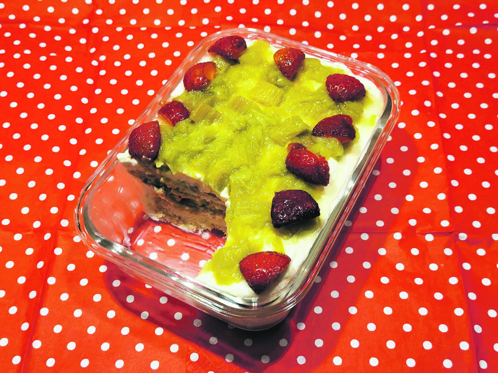 Nupat pagatavoju gardu kārtojumu, kas vizuāli atgādina “Tiramisu”. Rabarberu kātus noskaloju, nomizoju, sagriezu gabaliņos un katliņā kopā ar cukuru pavisam nelielā ūdens daudzumā vārīju uz vidējas uguns, līdz tie jau sāka šķīst. Tad katliņu noņēmu no uguns un biezeni pilnībā atdzesēju. To paveicu jau iepriekšējā vakarā, tāpēc kārtojuma pagatavošana neaizņēma ilgu laiku.