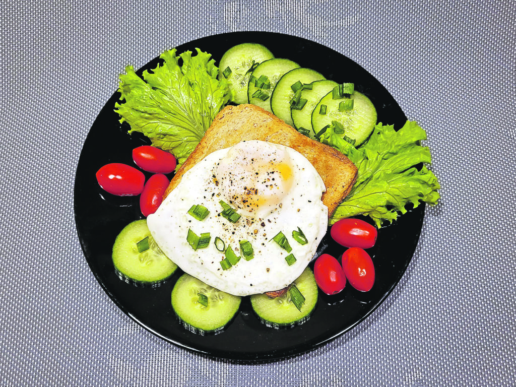 Tikmēr jau pannā izkausēju atlikušo sviestu, akurāti iesitu olas un izcepu “vēršacis”. Uzkaisīju sāli un maltus piparus. Tad olas izliku uz pildītajām maizītēm un papildināju maltīti ar svaigiem salātiem.