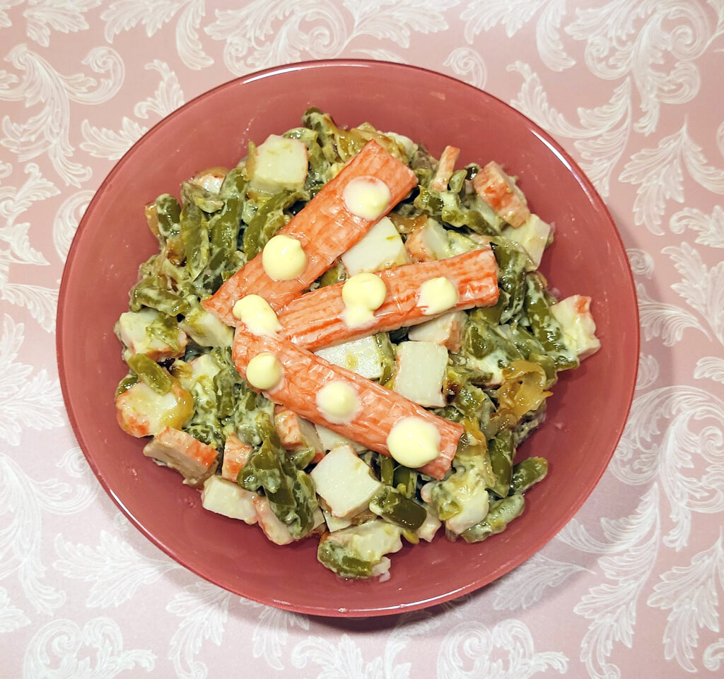 Krabju nūjiņas sagriezu ripiņās. Tad savienoju sagatavotās sastāvdaļas – ceptos sīpolus un pupiņu pākstis, kā arī krabju nūjiņas, pieliku majonēzi. Ja šķiet nepieciešams, varam piekaisīt arī mazliet sāls. Visu samaisīju un pārliku salāttraukā. Ja ir, varam uzkaisīt arī kādu sasmalcinātu zaļumiņu.