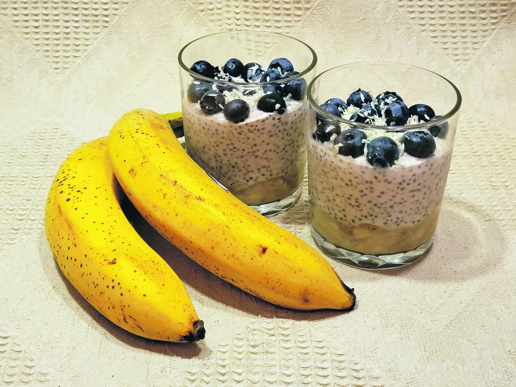 Desertu veidoju stikla glāzēs, apakšā izliekot banānu biezeni, tad – čijas sēklu pudiņu, ko, savukārt, rotāju ar mellenēm. Visu vēl pārkaisīju ar kokosriekstu skaidiņām.